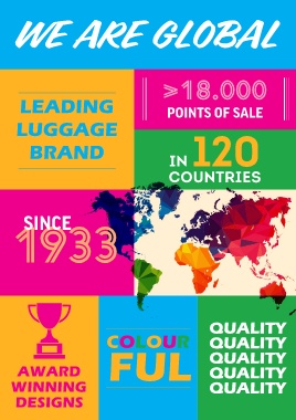 WE ARE GLOBAL >18.000 LEADING POINTS OF SALE LUGGAGE BRAND in 120 COUNTRIES SINCE 1933 QUALITY COLOUR QUALITY FUL QUALITY AWARD QUALITY WINNING QUALITY DESIGNS