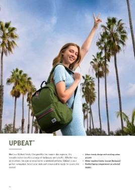 go to school, the gym or escaping for a weekend getaway, UpBeat is your • Water repellent fabric (except Backpack)