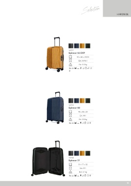 HARDSIDE 147117 Spinner 55 EXP 40 x 55 x 20/23 Est. 37/43 l Est. 2.2 kg 147119 Spinner 69 46 x 69 x 29 Est. 69 l Est. 2.8 kg 147120 Spinner 77 51 x 77 x 32 Est. 97 l Est. 3.1 kg 13