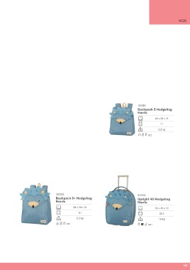 KIDS 120318 Backpack S Hedgehog Harris 24 x 28 x 14 7 l 0.2 kg 120322 120319 Backpack S+ Hedgehog Upright 45 Hedgehog Harris Harris 28 x 34 x 15 35 x 45 x 19 11 l 23 l 0.2 kg 1.6 kg 1 15757