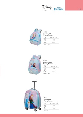 KIDS © Disney 145740 Backpack S Disney Frozen 23.5 x 28.5 x 13.5 7 l 0.3 kg 145742 Backpack S+ Disney Frozen 26 x 35 x 15 11 l 0.3 kg 145743 Spinner 46 Disney Frozen 33 x 46.5 x 22.5 20.5 l 1.7 kg 163