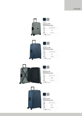 HARDSIDE 128014 Spinner 55 Post Consumer 40 x 55 x 20 34 l 2.9 kg 128015 Spinner 69 Post Consumer 49 x 69 x 29 79 l 4.2 kg 128016 Spinner 75 Post Consumer 52 x 75 x 31 102 l 4.6 kg 135147 Spinner 81 Post Consumer 55 x 81 x 35 138 l 5.0 kg 49