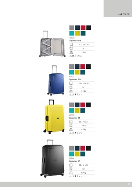 HARDSIDE 49539 Spinner 55 40 x 55 x 20 34 l 2.9 kg 49307 Spinner 69 49 x 69 x 29 79 l 4.2 kg 49308 Spinner 75 52 x 75 x 31 102 l 4.6 kg 59244 Spinner 81 55 x 81 x 35 138 l 5.0 kg 53
